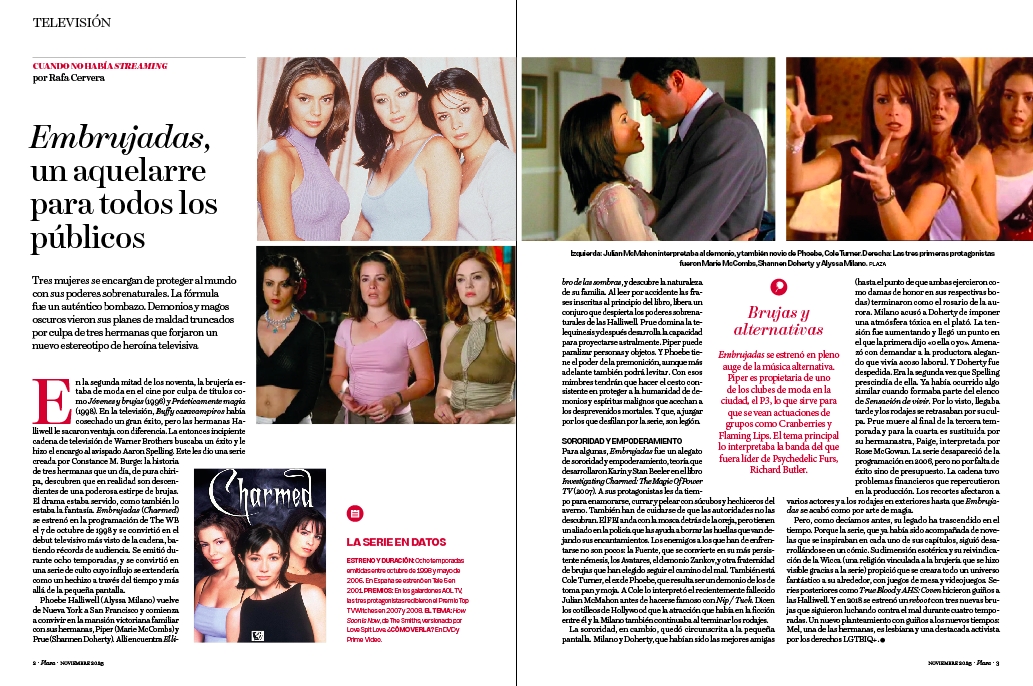 Para algunas, Embrujadas fue un alegato de sororidad y empoderamiento, teoría que desarrollaron Karin y Stan Beeler en el libro Investigating Charmed: The Magic Of Power TV (2007). A sus protagonistas les da tiempo para enamorarse, currar y pelear con súcubos y hechiceros del averno. También han de cuidarse de que las autoridades no las descubran. El FBI anda con la mosca detrás de la oreja, pero tienen un aliado en la policía que las ayuda a borrar las huellas que van dejando sus encantamientos. Los enemigos a los que han de enfrentarse no son pocos: la Fuente, que se convierte en su más persistente némesis, los Avatares, el demonio Zankov, y otra fraternidad de brujas que han elegido seguir el camino del mal. También está Cole Turner, el ex de Phoebe, que resulta ser un demonio de los de toma pan y moja. A Cole lo interpretó el recientemente fallecido Julian McMahon antes de hacerse famoso con Nip / Tuck. Dicen los cotilleos de Hollywood que la atracción que había en la ficción entre él y la Milano también continuaba al terminar los rodajes.