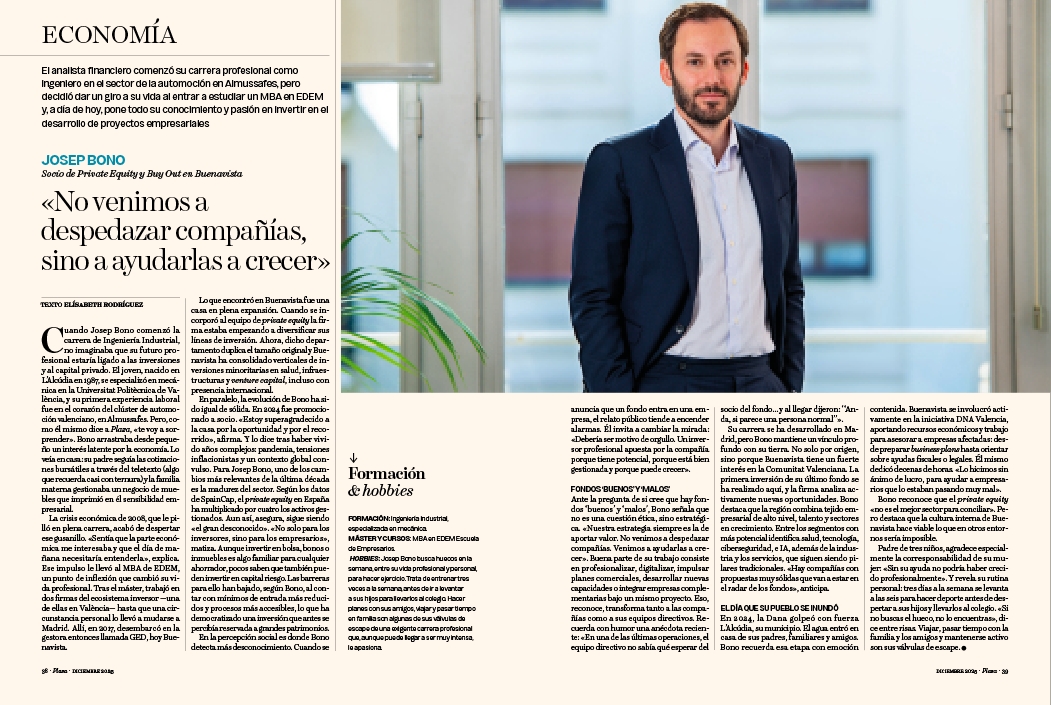 Cuando Josep Bono comenzó la carrera de Ingeniería Industrial, no imaginaba que su futuro profesional estaría ligado a las inversiones y al capital privado. El joven, nacido en L’Alcúdia en 1987, se especializó en mecánica en la Universitat Politècnica de València, y su primera experiencia laboral fue en el corazón del clúster de automoción valenciano, en Almussafes. Pero, como él mismo dice a Plaza, «te voy a sorprender». Bono arrastraba desde pequeño un interés latente por la economía. Lo veía en casa: su padre seguía las cotizaciones bursátiles a través del teletexto (algo que recuerda casi con ternura) y la familia materna gestionaba un negocio de muebles que imprimió en él sensibilidad empresarial.