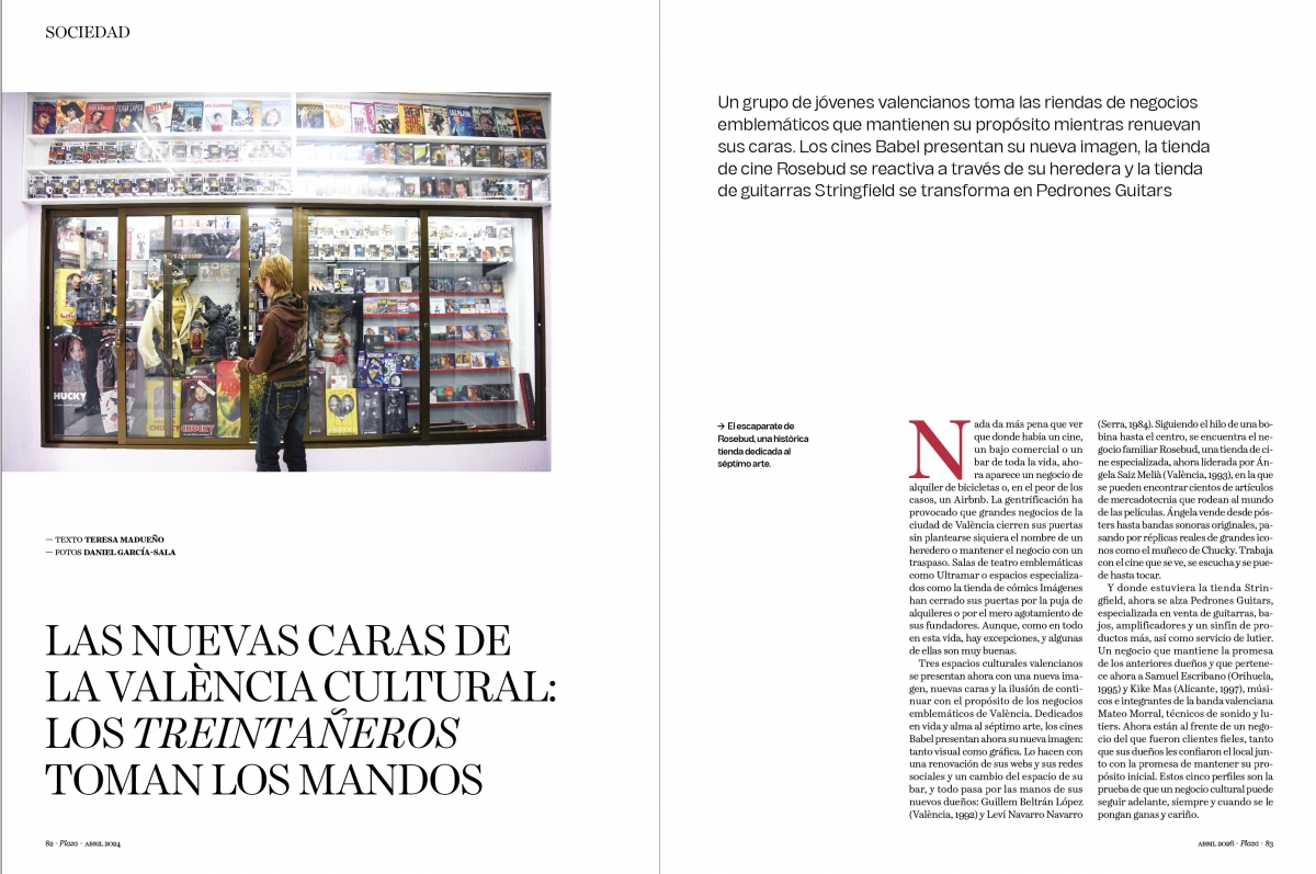 Tres espacios culturales valencianos se presentan ahora con una nueva imagen, nuevas caras y la ilusión de continuar con el propósito de los negocios emblemáticos de València. Dedicados en vida y alma al séptimo arte, los cines Babel presentan ahora su nueva imagen: tanto visual como gráfica. Lo hacen con una renovación de sus webs y sus redes sociales y un cambio del espacio de su bar, y todo pasa por las manos de sus nuevos dueños: Guillem Beltrán López (València, 1992) y Leví Navarro Navarro (Serra, 1984). Siguiendo el hilo de una bobina hasta el centro, se encuentra el negocio familiar Rosebud, una tienda de cine especializada, ahora liderada por Ángela Saiz Melià (València, 1993), en la que se pueden encontrar cientos de artículos de mercadotecnia que rodean al mundo de las películas. Ángela vende desde pósters hasta bandas sonoras originales, pasando por réplicas reales de grandes iconos como el muñeco de Chucky. Trabaja con el cine que se ve, se escucha y se puede hasta tocar.