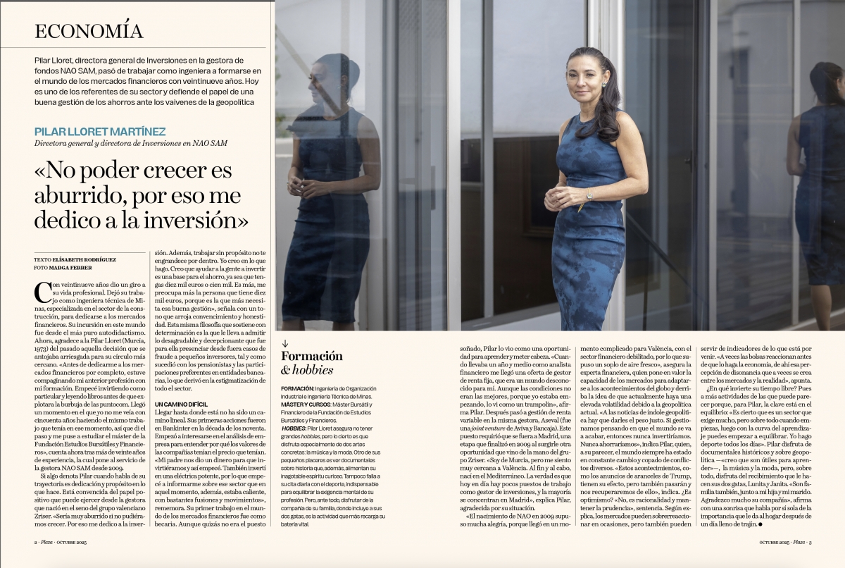 «El nacimiento de NAO en 2009 supuso mucha alegría, porque llegó en un momento complicado para València, con el sector financiero debilitado, por lo que supuso un soplo de aire fresco», asegura la experta financiera, quien pone en valor la capacidad de los mercados para adaptarse a los acontecimientos del globo y derriba la idea de que actualmente haya una elevada volatilidad debido a la geopolítica actual. «A las noticias de índole geopolítica hay que darles el peso justo. Si gestionamos pensando en que el mundo se va a acabar, entonces nunca invertiríamos. Nunca ahorraríamos», indica Pilar, quien, a su parecer, el mundo siempre ha estado en constante cambio y copado de conflictos diversos. «Estos acontecimientos, como los anuncios de aranceles de Trump, tienen su efecto, pero también pasarán y nos recuperaremos de ello», indica. ¿Es optimismo? «No, es racionalidad y mantener la prudencia», sentencia. Según explica, los mercados pueden sobrerreaccionar en ocasiones, pero también pueden servir de indicadores de lo que está por venir. «A veces las bolsas reaccionan antes de que lo haga la economía, de ahí esa percepción de disonancia que a veces se crea entre los mercados y la realidad», apunta.