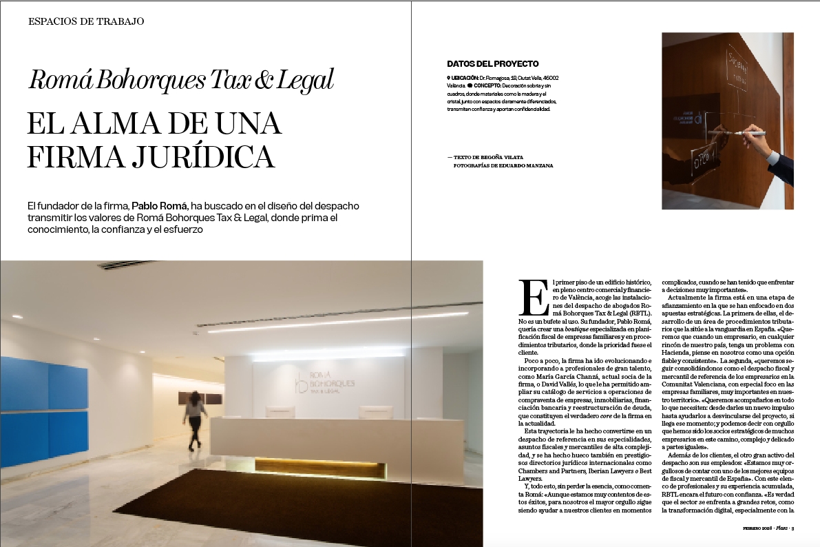 El primer piso de un edificio histórico, en pleno centro comercial y financiero de València, acoge las instalaciones del despacho de abogados Romá Bohorques Tax & Legal (RBTL). No es un bufete al uso. Su fundador, Pablo Romá, quería crear una boutique especializada en planificación fiscal de empresas familiares y en procedimientos tributarios, donde la prioridad fuese el cliente.