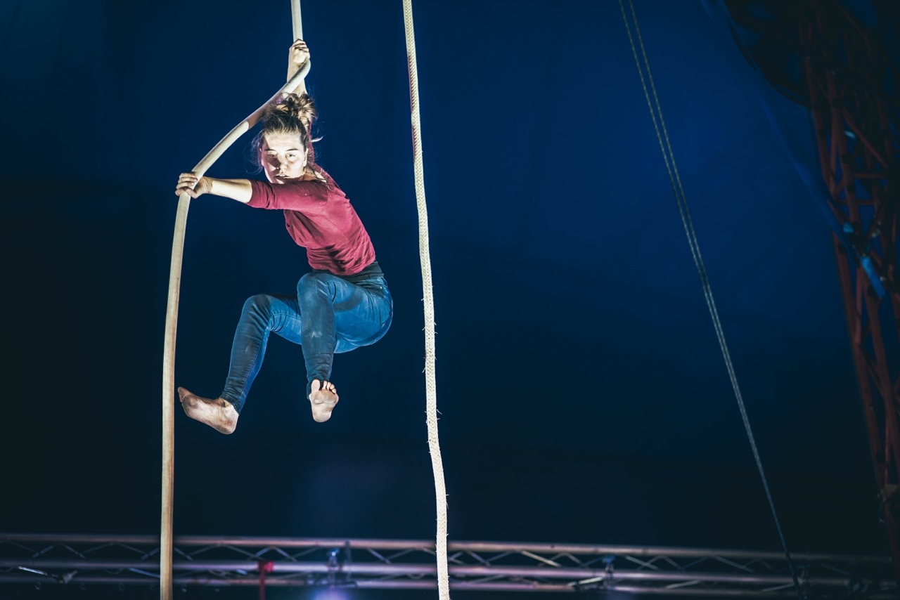 Sus disciplinas circenses se complementan con movimiento, texto y teatro. “Huimos de lo estético y buscamos darle más sentido al contenido que a la forma. Como consecuencia, hay momentos en nuestras propuestas en las que nos servimos del elemento aéreo, pero para integrarlo en el tema que queremos contar, de modo que podemos estar subidas simplemente mirando o respirando”, matiza Sabrina.