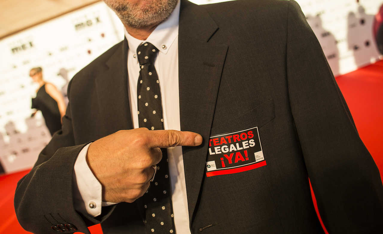 Segundo acto: 5 de junio de 2017. 20 horas. Hace calor y parece justificado el sudor de intranquilidad entre algunos responsables de la Administración valenciana a su llegada a la alfombra roja. No hay comentarios al respecto de la performance que se avecina. Les han garantizado que sucederá, pero queda una última esperanza: las formas. No saben exactamente hasta dónde llegará la rebelión y quizá la pataleta se quede, una vez más, en un gesto simbólico. Así es: unos minutos después, con sonrisas amplias y relajadas, muchos de los dueños de salas, productores y algunos actores portan una pegatina (y la reparten a los interesados). Dice: Teatros Legales ¡YA!.