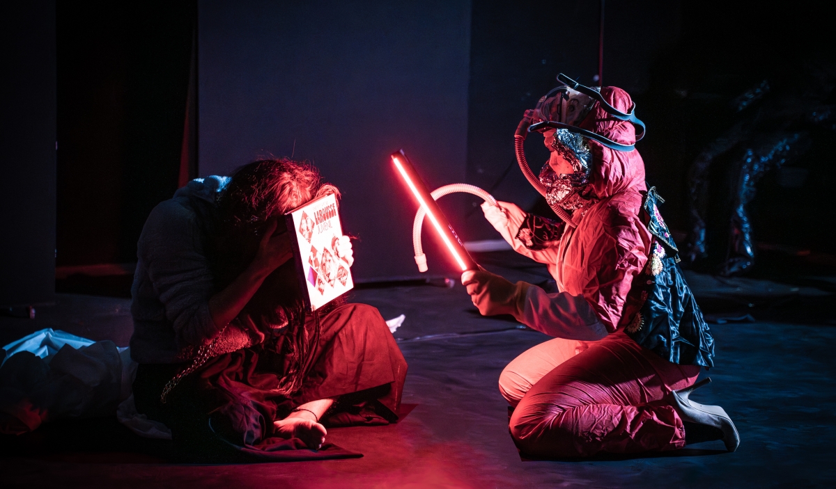 Esta base teórica se aterriza en una pieza escénica híbrida, guiada por la música de sintetizadores, la improvisación con materiales muy cercana a la performance y un texto evocador que recoge la esencia de una literatura recargada, llena de neologismos y construcciones imposibles que deja al espectador muy cercano a la experiencia sublimadora que buscan todas las piezas de la compañía pero haciendo más hincapié en el lado lúdico, alternando profundidad y humor y proponiendo convertir este apocalipsis maquínico en una fiesta.