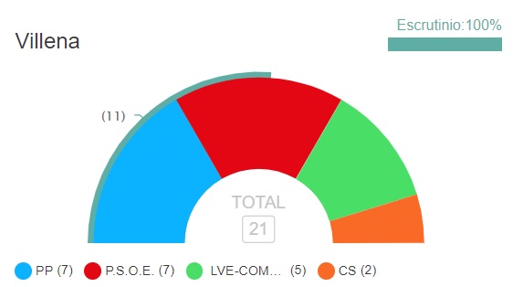 De esta manera, el electorado de Villena vuelve apostar por una mayoría progresista, pero esta vez con los socialistas como fuerza más votada. La candidatura de Cerdán pasa de tres concejales a siete, y suma cuatro, en parte de los seis que pierden Los Verdes del actual alcalde, Francisco Javier Esquembre, que en estos comicios iba en coalición con Compromís.