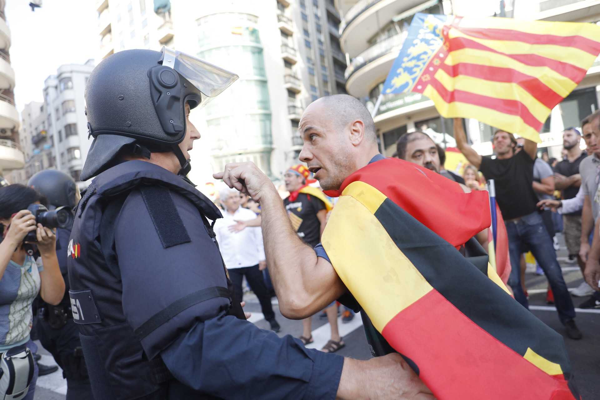 VALÈNCIA (VP/EFE). La Policía mantiene separados a un grupo de unas 150 personas con banderas españolas y a otro de una treintena de simpatizantes de la CUP a los que el primero habría atacado antes del inicio de la manifestación convocada por la Comissió 9 d'Octubre por el centro de València.