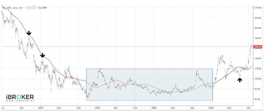 En el gráfico de largo plazo observamos que, después de una fuerte caída desde los máximos históricos de octubre de 2020, la acción entró en un amplio movimiento lateral que se mantuvo desde mediados de octubre de 2022 hasta comienzos de 2025. A partir de ahí rompió esa tendencia y comenzó un fuerte impulso alcista, que ya le ha permitido revalorizarse más de un 100% respecto a los precios anteriores.