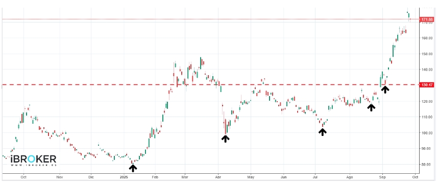 Sin embargo, dada la verticalidad del movimiento, no puede descartarse un retroceso o una pausa en la cotización, algo similar a lo que ya ocurrió al marcar máximos relativos en abril de 2025.