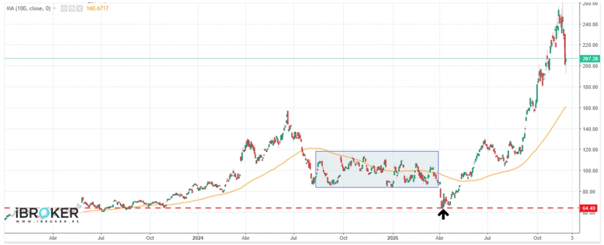 Al analizar un gráfico de largo plazo, se aprecia que el valor mantiene un impulso alcista explosivo desde los mínimos de abril. Este tramo sostenido refleja una presión compradora muy intensa, que ha impulsado una revalorización superior al 200%, situando al precio muy por encima de zonas previas de consolidación.