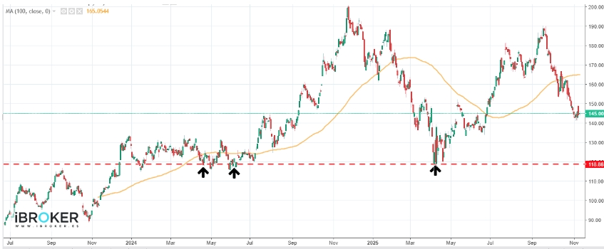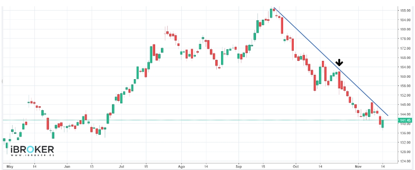 Al analizar el gráfico en horizontes de corto y medio plazo, se observa con claridad la corrección iniciada desde los máximos relativos registrados en septiembre, en torno a los 190$, movimiento que ha supuesto una pérdida superior al 20% en la cotización.