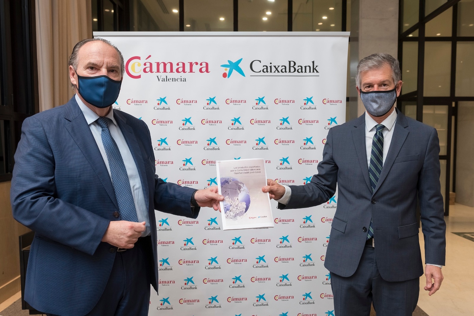 VALÈNCIA.El presidente de Cámara Valencia, José Vicente Morata, y el director territorial de CaixaBank en la Comunitat Valenciana, Xicu Costa, han presentado el informe "Los productos exportados por la Comunidad Valenciana: Oportunidades post-Covid".