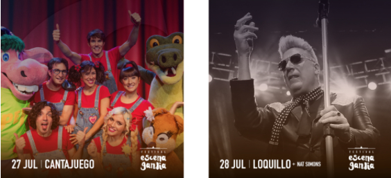 Cantajuego con su gira "Yo tengo derecho a jugar" actuará para nuestro público más joven el día 27 de julio. El 28 de julio, repasaremos los temas más conocidos de Loquillo,acompañado de Nat Simons con su gira "40 años de Rock and Roll actitud".