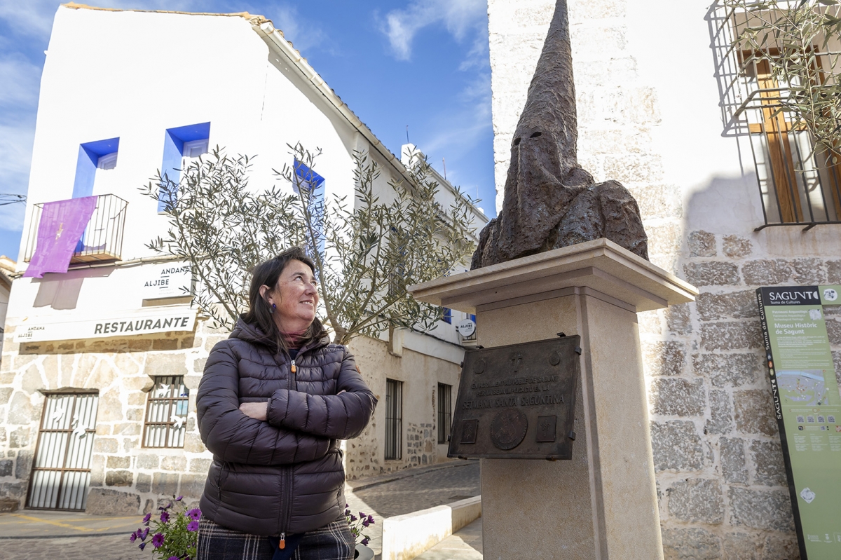 - Blanca Ribelles, portavoz de Semana Santa Inclusiva de Sagunto, frente al busto de un cofrade.- Foto: MARGA FERRER