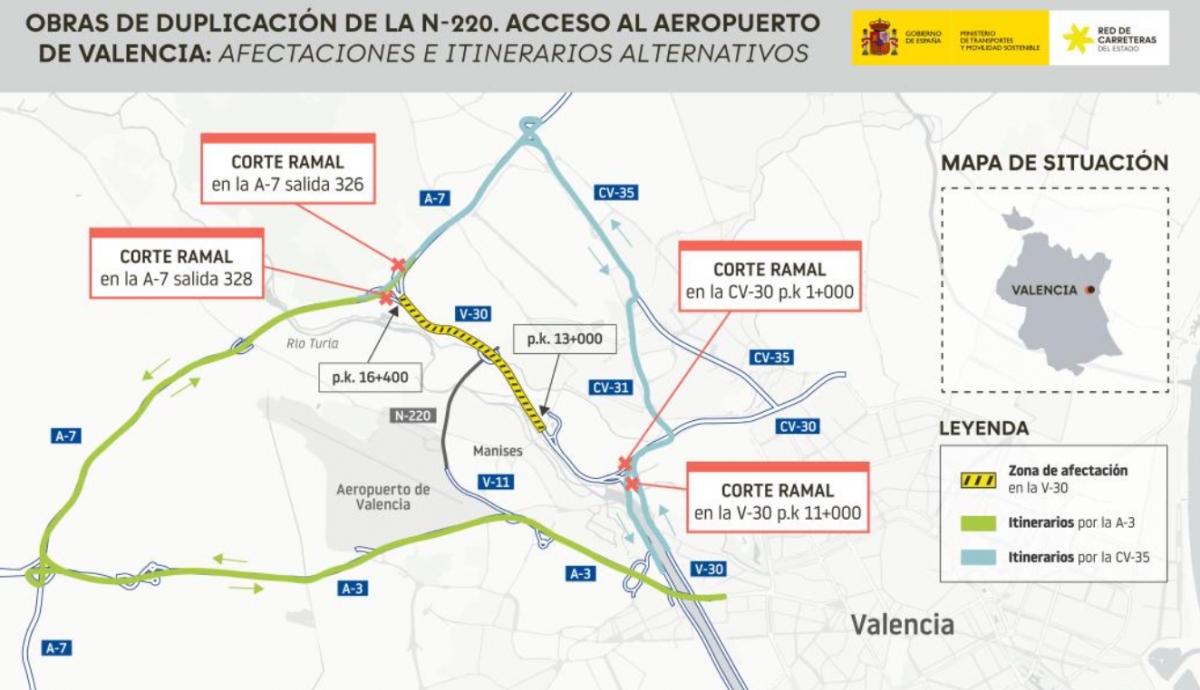 MADRID. El Ministerio de Transportes y Movilidad Sostenible avanza en la ejecución de las obras de duplicación de la calzada de la carretera N-220, que da acceso al Aeropuerto de Valencia, en el tramo enlace Aeropuerto / enlace V-30, en la provincia de Valencia. Esta actuación cuenta con un presupuesto total de 103,3 millones de euros (IVA incluido).