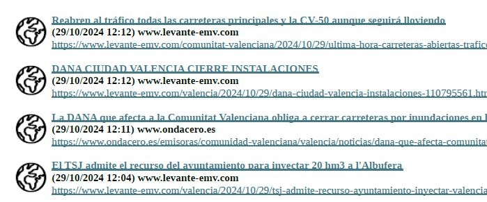 "Calma tensa a la espera de la llegada de un temporal de lluvias torrenciales", expone una información de las 16.54h del día 28. Y como esta, numerosas informaciones que se comunicaron instantáneamente a la conselleria encargada de las Emergencias. Hay titulares también sobre las cancelaciones de clases y actividades en Elche, Crevillent y Santa Pola. También sobre la provincia de Castellón, donde la Dana tomaba "fuerza en el interior de la provincia con lluvias que superan los 150 l/m² en varios municipios", según otra noticia. En la provincia de Valencia también empezaban a tomarse precauciones: "Algemesí suspende esta noche el servicio de recogida de basura por las lluvias", reza otro titular.