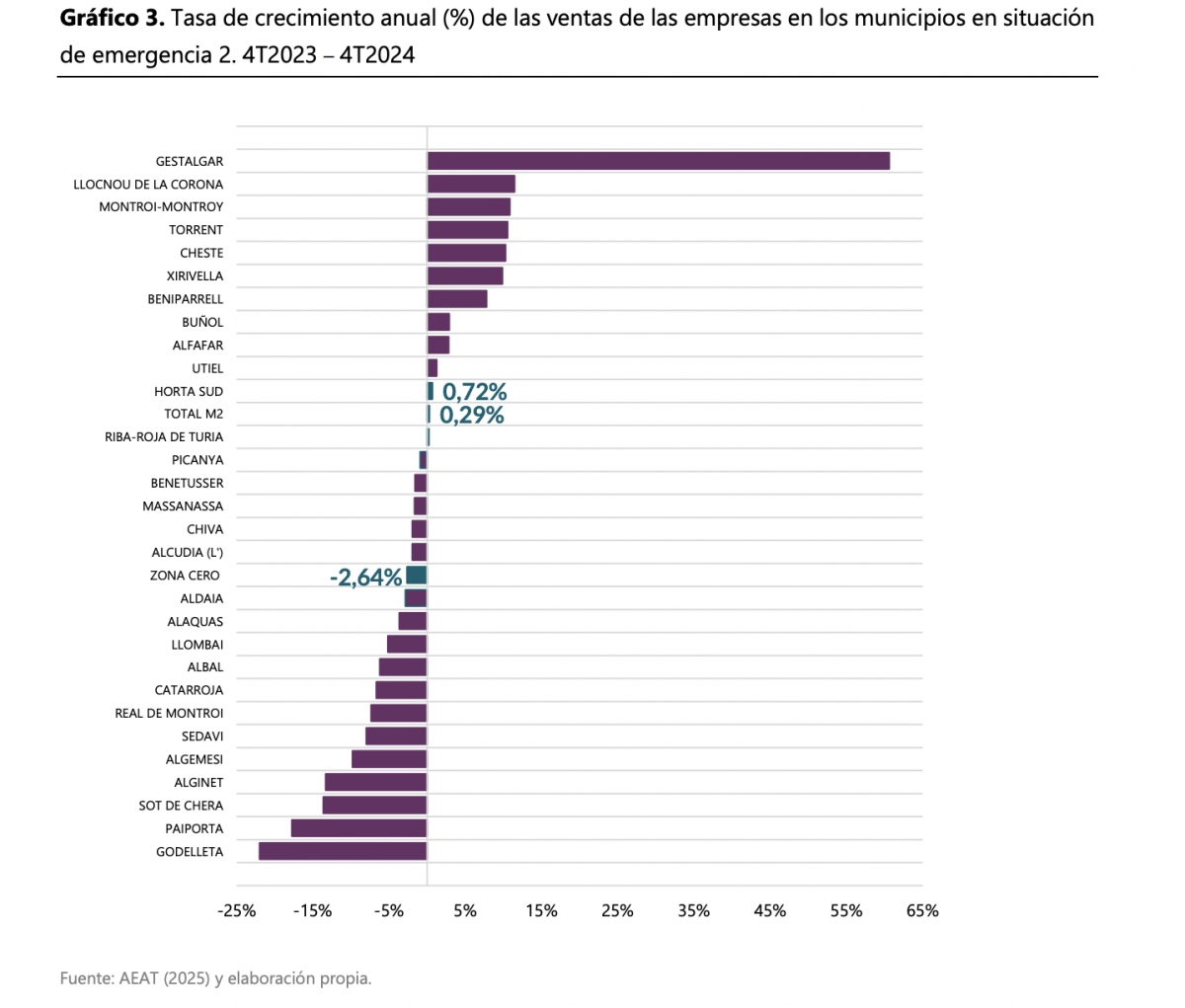En el global de los municipios afectados, las ventas empresariales aumentaron un 3% en el cuarto trimestre de 2024 y un 6,1% en el primero de 2025. Sin embargo, los datos cambian radicalmente cuando se pone el foco en las zonas más perjudicadas. En los 28 municipios en situación de emergencia 2, el crecimiento apenas fue del 0,3% al cierre de 2024, aunque repuntó más fuerte, con un 7,4%, en el primer trimestre de 2025.