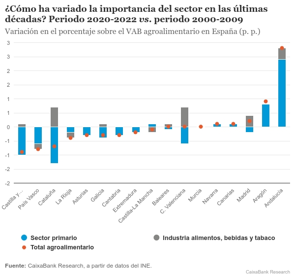 A nivel agregado, se percibe que el peso del sector en las economías regionales se está moderando, como consecuencia del proceso secular de terciarización económica. También se observa que, dentro del sector agroalimentario, la industria va ganando peso gradualmente. En cifras, el sector ha pasado de aportar un 5,5% al VAB de España en la década de los 2000 a aportar un 5,2% en la década actual, y que la industria ha pasado de aportar un 43% al VAB del sector en los 2000 a un 45% en la actualidad.