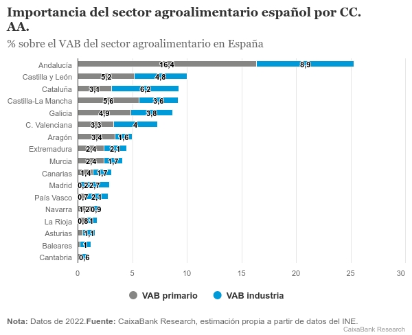 A grandes rasgos, las provincias andaluzas y algunas provincias del Levante español son las que más aportan al sector nacional. Concretamente, Almería, Sevilla, Barcelona, Murcia y Valencia aportan en conjunto más del 20% del VAB del sector nacional. Exceptuando el caso de Barcelona (donde prevalece la importancia de su industria agroalimentaria, que aporta por sí sola el 3,7% del sector), son provincias que se caracterizan por un potente sector primario (es donde más aporta al total del VAB del sector). En el extremo opuesto, Soria, Ávila, Palencia, Segovia y Vizcaya son las provincias que menos aportan al sector agroalimentario nacional. Resulta llamativo el caso de Castilla y León: aunque a nivel autonómico aporta más del 10% del VAB del sector, a nivel provincial solo León y, especialmente, Salamanca superan la mediana nacional.