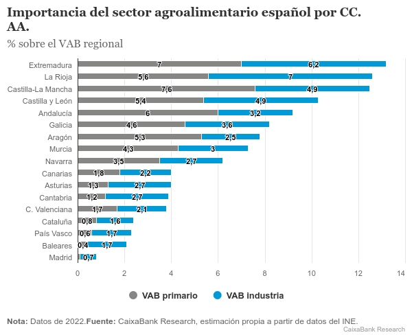 En cuanto al peso del sector en las economías regionales, es cada vez menor, siendo La Rioja, Extremadura y Cantabria donde más ha perdido. Por el contrario, en contra de la tendencia del conjunto del país, el sector ha ganado peso en Aragón (donde destaca el sector ganadero, sobre todo la cabaña porcina), Andalucía y Canarias.