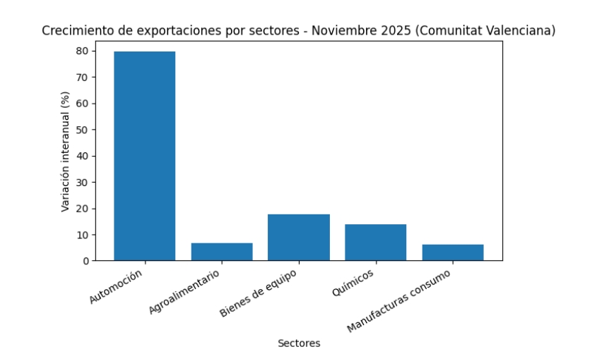 El avance en exportaciones, aunque moderado, consolida la recuperación del comercio exterior valenciano y que ha venido impulsado, sobre todo, por la reactivación del sector de la automoción, que se disparó en el mes de noviembre un 79,7%, un dato que rompe la dinámica negativa de los cinco meses de caídas que llegó a encadenar en 2025. Este repunte ha compensado la debilidad mostrada a lo largo del año y que ha influido positivamente en el resultado global.