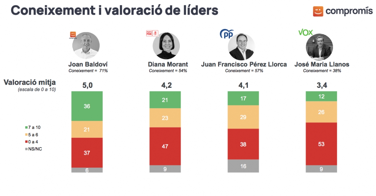 Otro de los apartados facilitados es el grado de valoración y notoriedad de diferentes dirigentes de la política valenciana. El portavoz de Compromís, Joan Baldoví, se sitúa como el mejor puntuado (5 sobre 10), con un nivel de conocimiento del 71%.