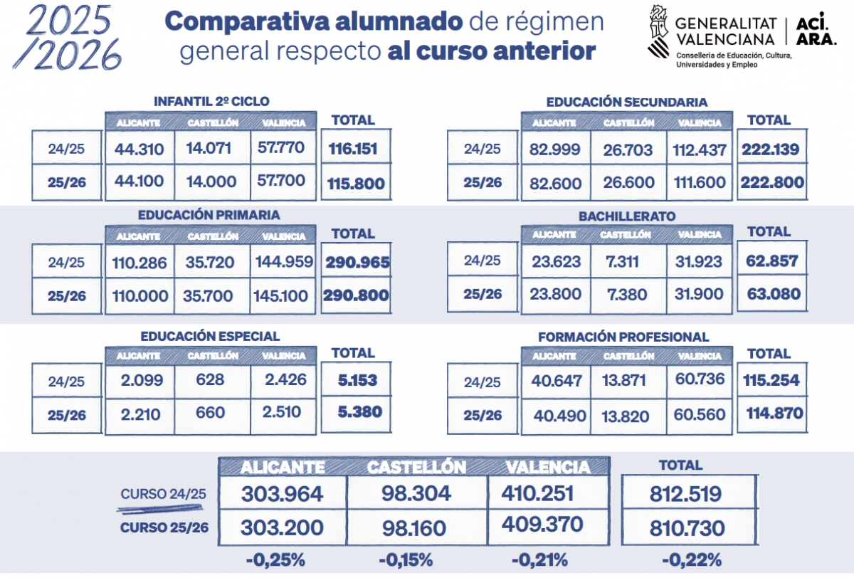 En esta línea, el alumnado cae en Educación Infantil, Educación Primaria y Formación Profesional; pero aumenta en Educación Secundaria, Educación Especial y Bachillerato. Por provincias, se reduce el número de estudiantes en todas ellas, aunque el descenso es menos acusado en Castellón (-0,15%) que en Valencia (-0,21%) y Alicante (-0,25%).