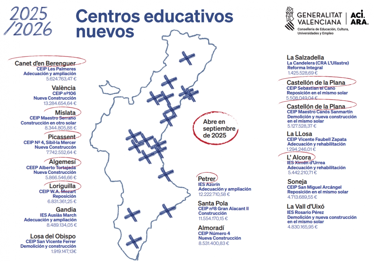 Sobre esta veintena de centros, cabe mencionar que tres de ellos son de nueva construcción, mientras el resto de casos van desde una reforma integral hasta la demolición y reconstrucción en el mismo solar, pasando por algunos edificios que han recibido trabajos de adecuación y rehabilitación. Respecto a otro tipo de servicios, Rovira ha detallado que la Conselleria destinará 76,3 millones de euros en becas del comedor escolar, que beneficiará a 150.000 alumnos, de los cuales más de la mitad tendrá cubierta la totalidad del coste. En materia de transporte escolar, habrá 44.800 beneficiarios, con 3.400 ayudas individuales y un desembolso total cercano a los 75 millones de euros.