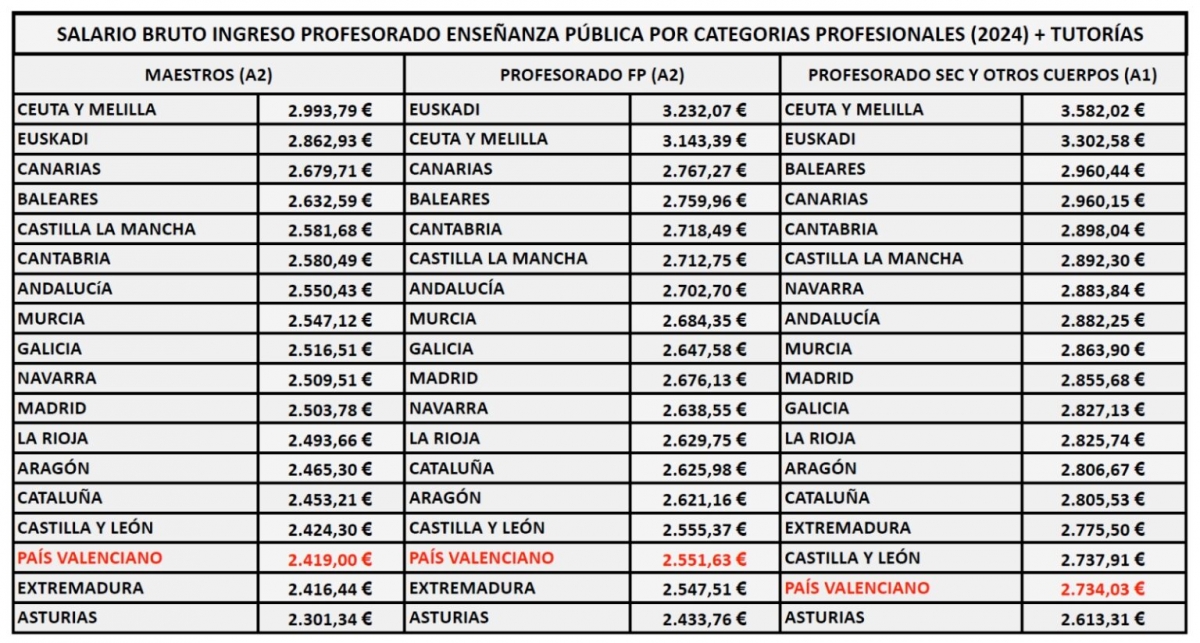 En este punto cabe mencionar que un informe de UGT Serveis Públics ponía de relieve este jueves la "brecha salarial" del profesorado valenciano, cuyas retribuciones son las más bajas de España tras las de los docentes asturianos y extremeños. "La ausencia de propuestas por parte de la Conselleria de Educación, sumada a la creciente brecha salarial, sitúa el personal docente valenciano en una situación de clara desventaja profesional frente al resto del Estado y alimenta el malestar generalizado en los centros públicos", señala el sindicato.