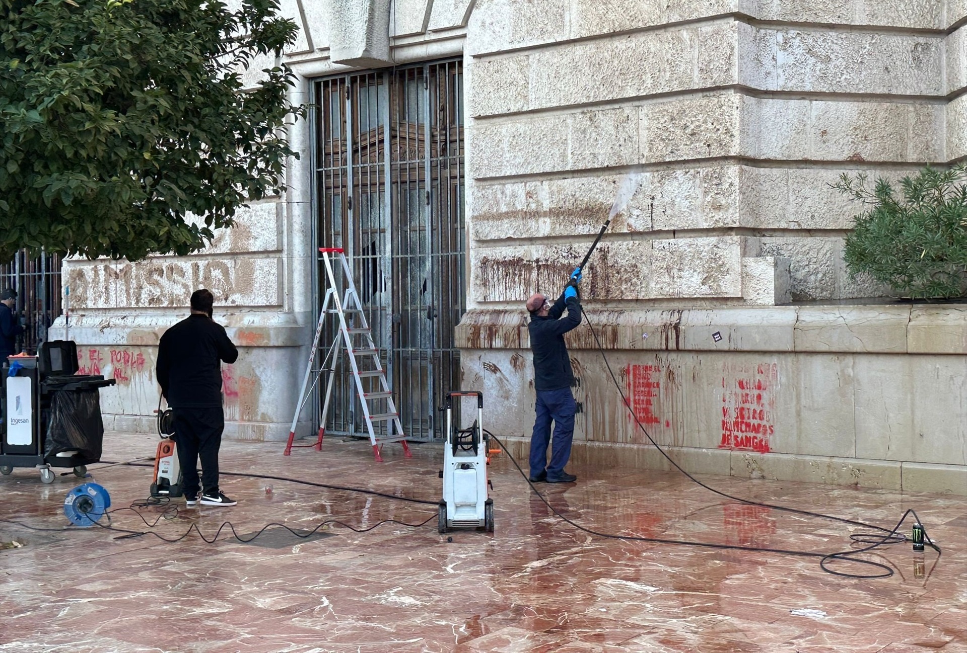 VALÈNCIA (EP). Operarios municipales han comenzado a limpiar a primera hora de este domingo las pintadas y a retirar los carteles colocados en la fachada del Ayuntamiento de València durante la manifestación que recorrió este sábado por la tarde las calles del centro de València para pedir responsabilidades por la gestión de la Dana.