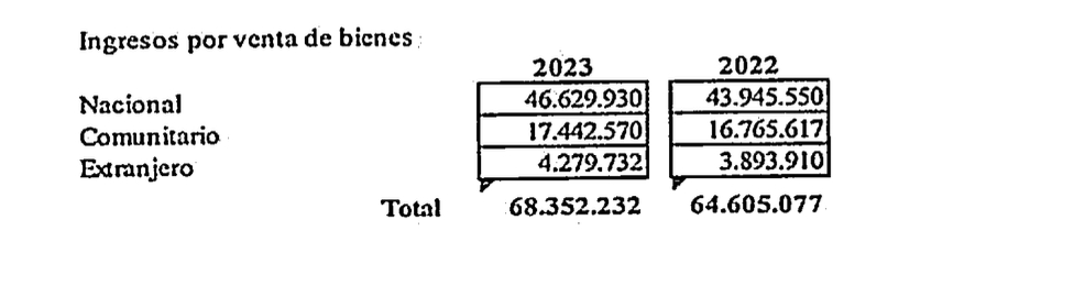 El mayor incremento de la compañía se dio en las ventas al extranjero, que pasaron de 3,89 millones en 2022 a 4,27 millones en 2023, con un crecimiento del 9,90%. Por su parte, las ventas nacionales, que representan la mayor parte de los ingresos, crecieron un 6,11%, al pasar de 43,94 millones en 2022 a 46,62 millones en 2023. En el ámbito comunitario, los ingresos por ventas subieron de 16,76 millones a 17,44 millones, lo que equivale a un incremento del 4,03%.