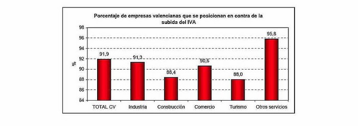 La gran mayoría de los entrevistados están en contra de la medida, en concreto, un 91,9%. Las empresas valencianas pertenecientes al sector de hostelería y turismo son las que registran un menor porcentaje de compañías que están en contra de la subida del IVA, lo que contrasta con los resultados nacionales, ya que este sector es el que más en contra está.