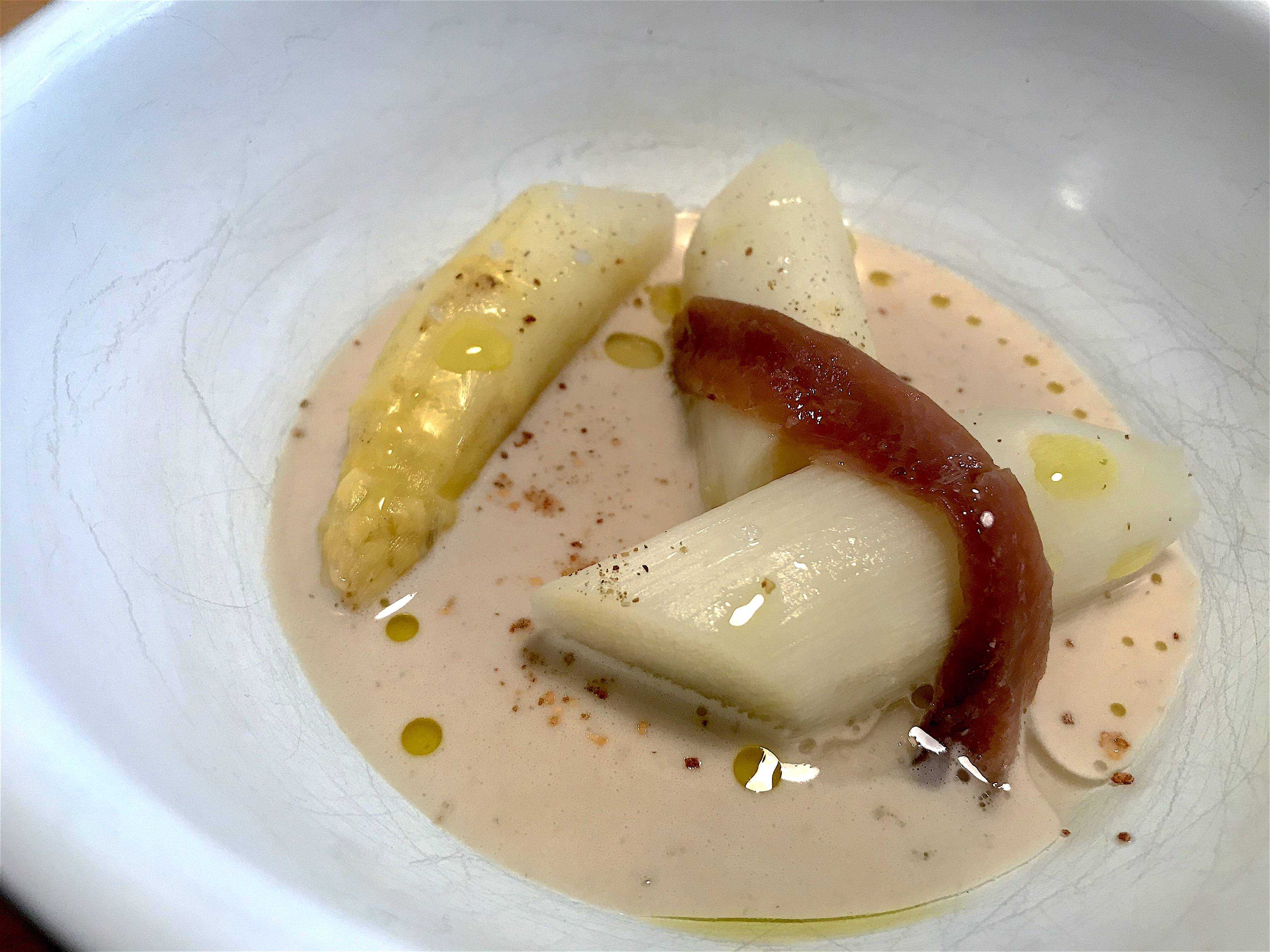 El antiguo local de calle MurilloBerenjena con yogurBacalao con ajoarrieroVolvamos a los espárragos. “Por lo general nos abastacemos con productos de proximidad, pero hay ingredientes que como cocineros nos flipan, y el espárrago navarro se encuentra entre ellos”, explica Nuévalos. Para equilibrar los orígenes, las hortalizas se bañan en una suerte de horchata sin azúcar, que se termina con un toque de sake, de modo que se acentúa el punto cortante del almidón. “Luego le ponemos una anchoa, y así jugamos con el sabor salado, además del dulce y del amargo”, detalla el cocinero. El plato estará disponible estos días, al menos esta semana, "porque en cuanto empiezan a tener hebras, nuestro proveedor dejará de enviarnos espárragos y los destinará a la industria de las conservas". Honestidad.