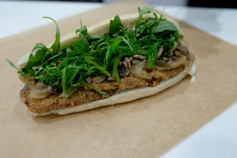 Ya lo decía en diciembre cuando hablaba de esta nueva Dark Kitchen vegana, que su Frenchy Sandwich era una maravilla. Veganum es muchas cosas menos convencional, y eso que su concepto podría parecerlo. Fast food vegano con una carta de hamburguesas, wraps y sándwiches. Hasta aquí, poca novedad. Pero cuando te adentras en esa carta vegetal y empiezas a leer los ingredientes, empiezas a oler de qué va la cosa. Y es que me parece brutal que alguien piense en meter wakame entre dos panes. Y eso es lo que tiene este sándwich y el motivo de mi predilección. Dos rebanadas de pan esponjoso y tierno rellenas de seitán marinado con mostaza Dijon, cebolla caramelizada, setas salteadas, wakame, rúcula, veganesa de lima y salsa de mostaza es la mezcla de este sándwich.