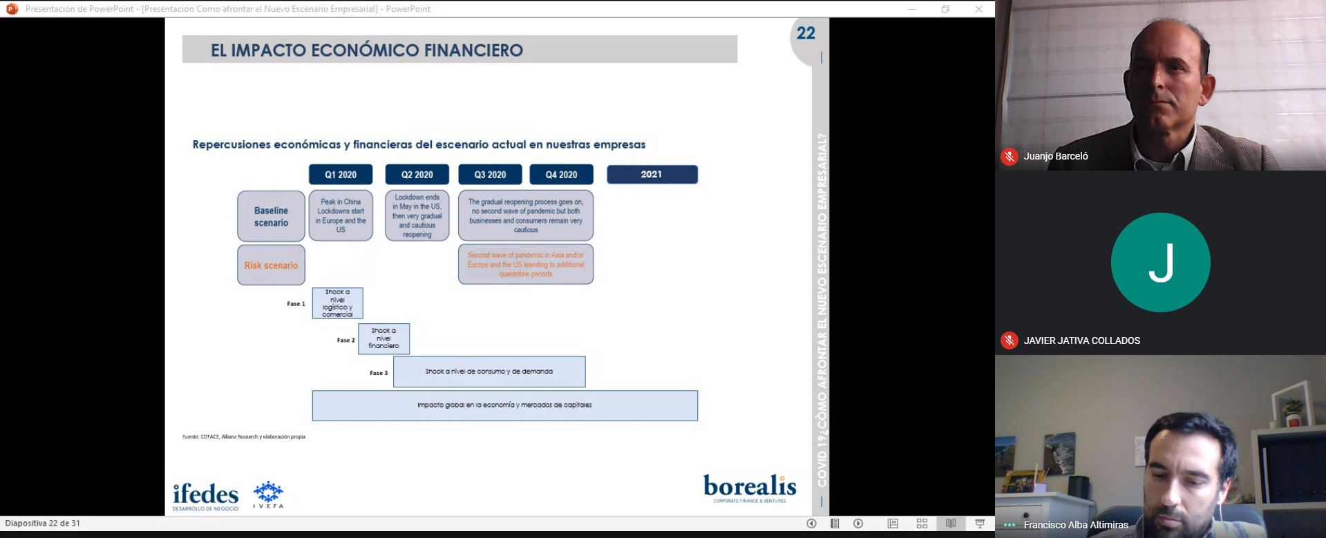El objetivo de la sesión de ayer fue informar a los asociados sobre las medidas urgentes extraordinarias establecidas para hacer frente al impacto económico y social del COVID-19. La ponencia corrió a cargo de Juan José Barceló, Consultor Desarrollo de Negocio en Grupo Ifedes y miembro asesor independiente en Consejos de Administración y Comités de Dirección; y Francisco Alba, Consultor de Operaciones Corporativas de la división de Corporate Finance & Ventures de Grupo Ifedes, Borealis.