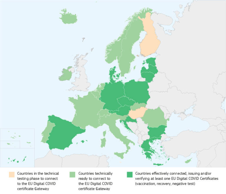 En estos momentos, además de España, también están conectados efectivamente los países bálticos. Mientras que otros están preparados técnicamente para conectarse, como por ejemplo, Francia, Italia, Bélgica o Portugal, entre otros. De hecho, la semana pasada, al entrar a Francia, ya se podía presentar el certificado digital covid, aunque los ciudadanos franceses aún no lo tengan disponible. En eta situación se encuentran también los cuatro países del Espacio Económico europeo: Liechtenstein, Suiza, Noruega e Islandia. Mientras que Finlandia y Hungría son los más rezagados y aun se encuentran en fase de pruebas técnicas.