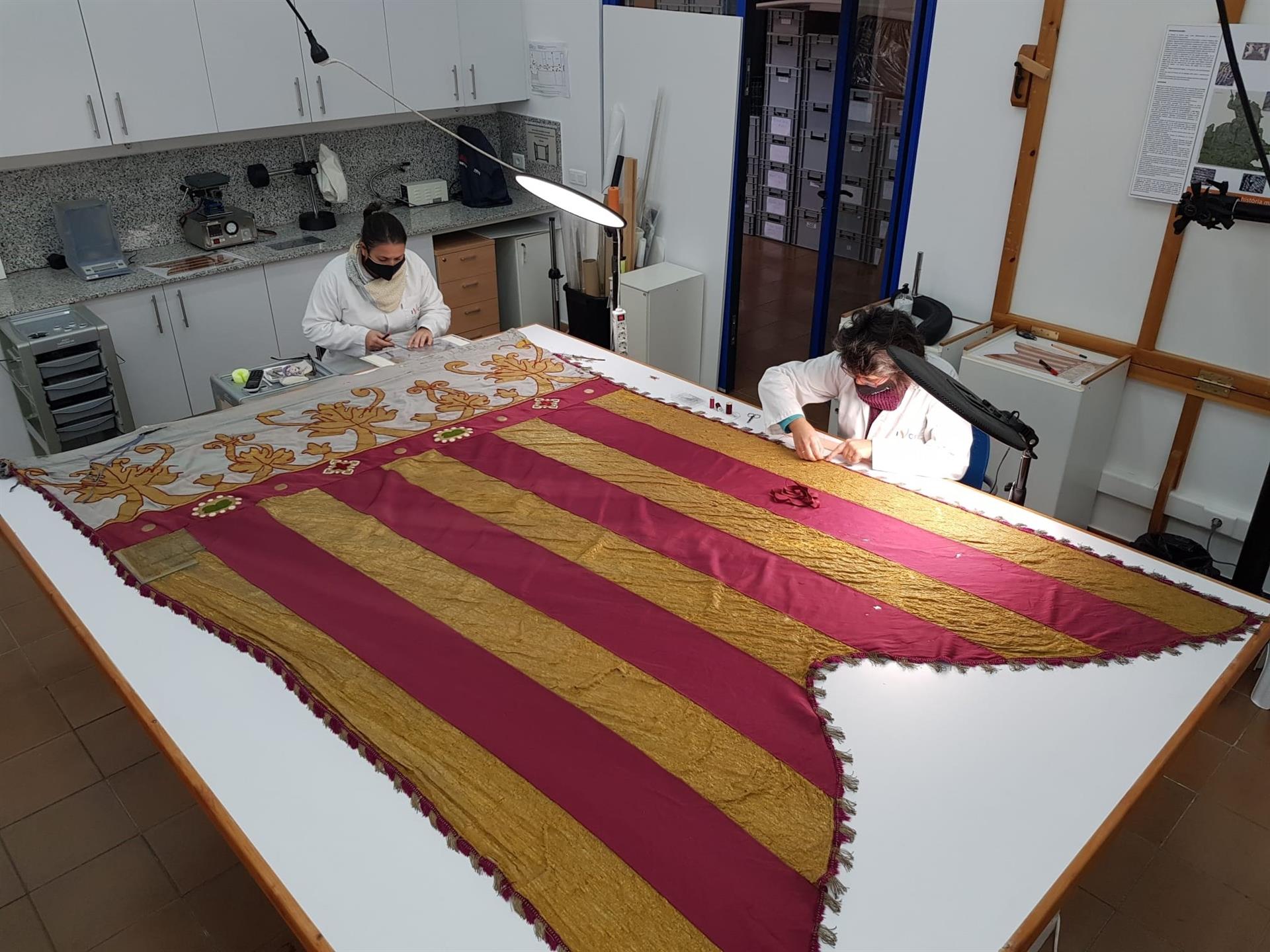 El nuevo tejido de protección se propone como respuesta a la necesidad manifestada por los técnicos del Ayuntamiento de continuar utilizando el facsímil en los actos públicos de procesión cívica del próximo año. Al mismo tiempo, se están consolidando mediante costura las zonas desgarradas en la pasamanería perimetral, concluye.