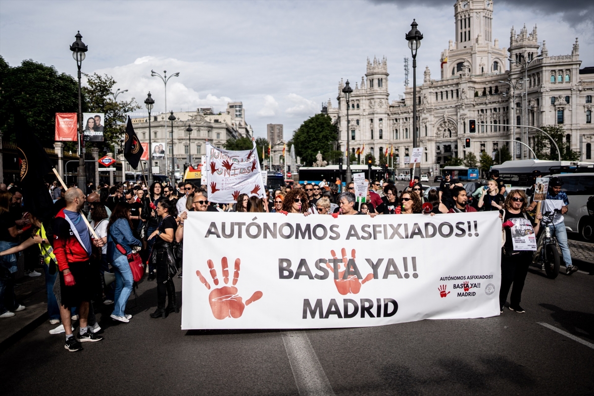 Portando una pancarta con el lema 'Autónomos asfixiados. Basta ya', los participantes en la marcha han coreado consignas como 'Sin autónomos, España se hunde', 'Vamos a rezar para poder pagar' y 'No más burocracia, queremos eficacia'.