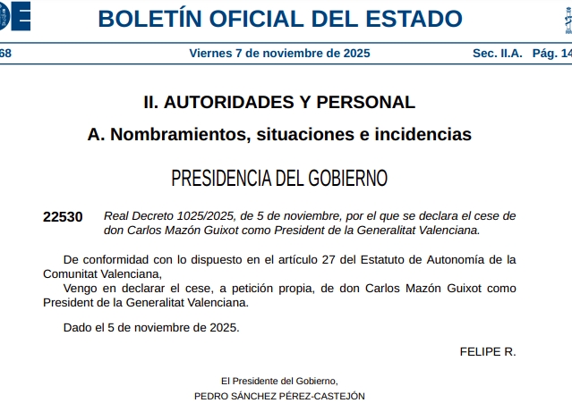 Peor aún es la publicación apresurada del cese en el BOE, un hecho insólito que ha provocado que el Rey y Sánchez den oficialidad en toda España a algo que no ha ocurrido, puesto que Mazón no ha cesado como presidente y puede que no lo haga, en el peor de los casos, hasta mayo de 2026.
