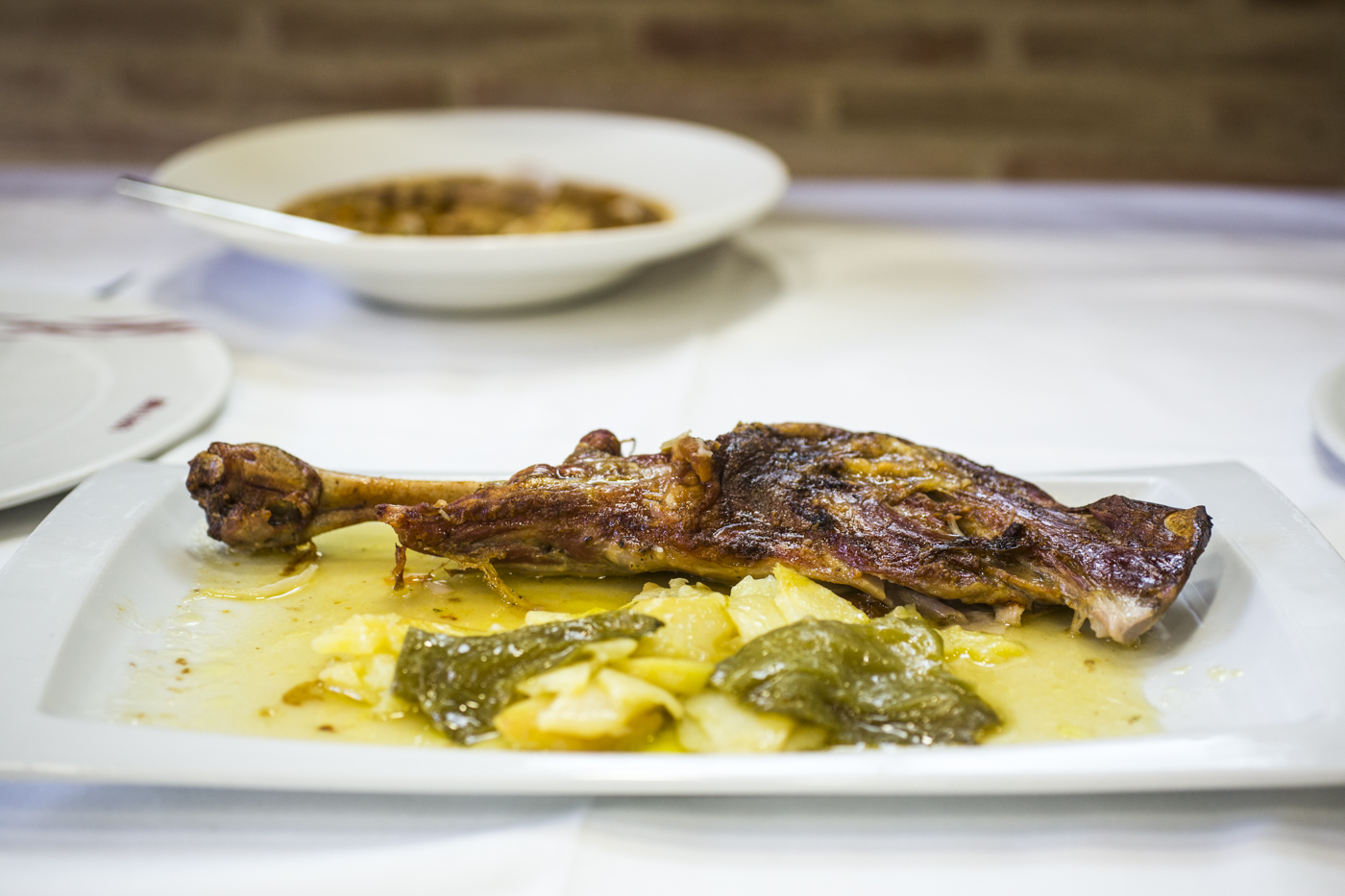 Nos tomamos los entrantes con una extraña sensación de incertidumbre y esperanza. Por cierto, qué croquetas, y sobre todo, menudo sepionet (se batió en duelo con el cordero para ocupar el plato de la semana). Una tapita de patatas a la riojana después, Santi nos trajo el último trozo de cordero que les quedaba. Y sonaron campanas celestiales.