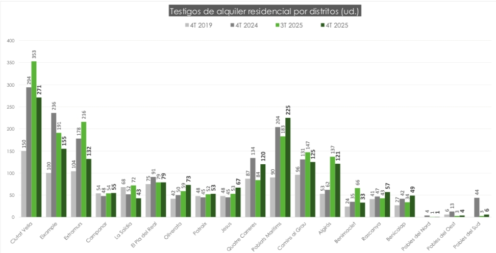 El bloque intermedio lo forman barrios como Quatre Carreres, Benimaclet, Rascanya, Benicalap, Jesús o Patraix, con volúmenes que oscilan entre los 50 y 120 testigos. Aquí el mercado se muestra más fragmentado porque hay menos rotación, mayor peso del alquiler residencial clásico y una menor presencia de grandes bolsas de oferta.