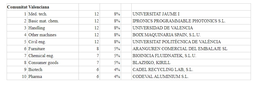Dentro de este contexto, el listado de principales solicitantes en la Comunitat Valenciana muestra una distribución sectorial diversa. Desde tecnología médica y biotecnología hasta maquinaria industrial, embalaje o materiales, las solicitudes proceden de ámbitos que reflejan tanto la especialización industrial del territorio como la actividad investigadora.