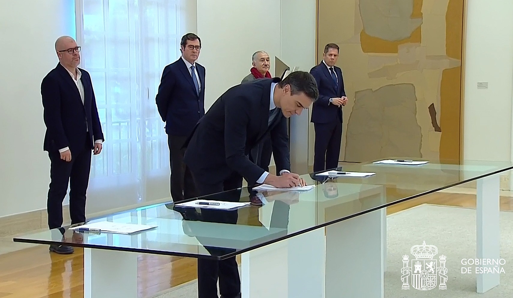En la firma han estado presentes por parte del Ejecutivo el vicepresidente de Derechos Sociales y Agenda 2030, Pablo Iglesias; la vicepresidenta de Asuntos Económicos y para la Digitalización, Nadia Calviño; la ministra de Hacienda, María Jesús Montero; la ministra de Trabajo, Yolanda Díaz; y el ministro de Seguridad Social, José Luis Escrivá.