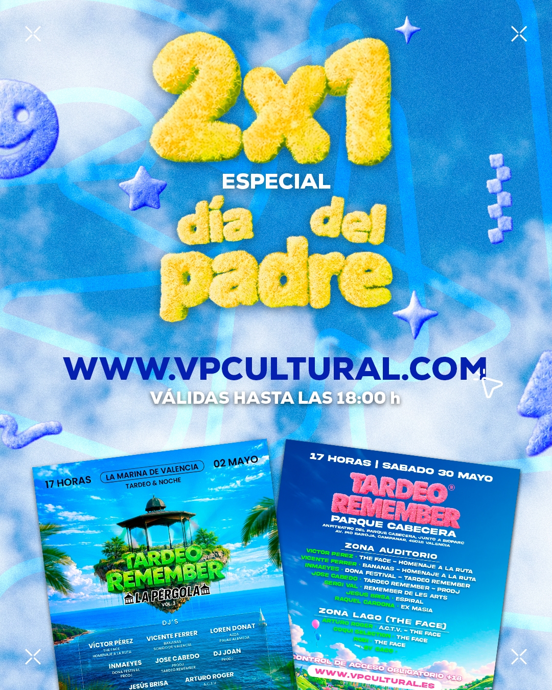VALÈNCIA. Tardeo Remember® lanza una promoción especial 2x1 en entradas con motivo del Día del Padre para sus próximas citas del viernes 2 de mayo y viernes 30 de mayo, dos jornadas que prometen reunir a miles de asistentes en torno al auténtico sonido remember en un ambiente festivo con música y emociones que marcaron a toda una generación.