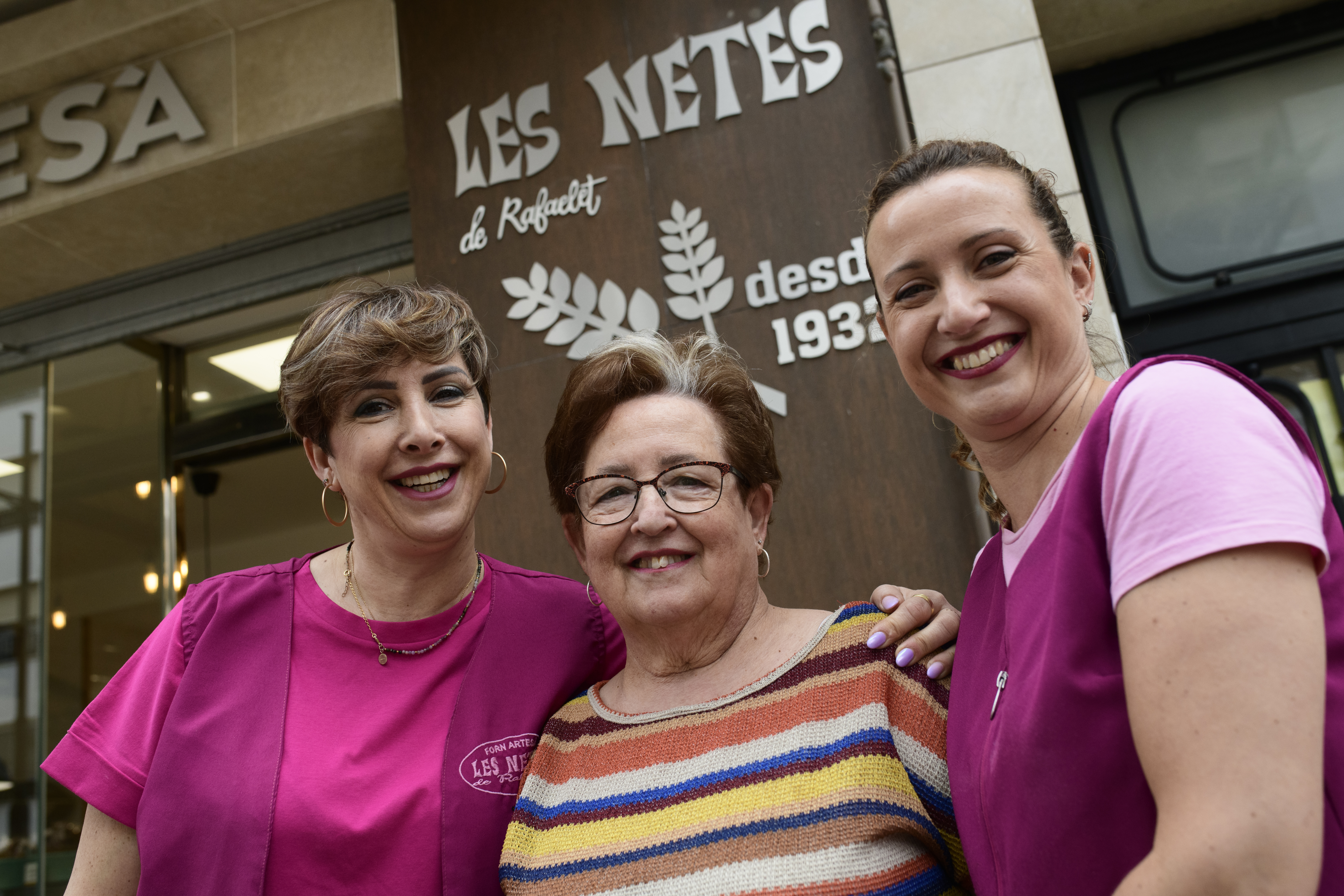 En l'aparador Mamen, amb la seua divisa Rosa i en l'obrador Merche, també uniformada, són les Netes d'eixe matriarcat que és la seua casa. "Som 9 persones treballant al forn, els dos forners i set dones", elles guanyen per majoria, i per això tots van amb l'uniforme rosa. A l'hortet de la Punta, on estava aquell primer forn dels seus besavis, sa mare planta les carabasses i cull les llimes que després gasten en el forn. Eixen de l'obrador safates de magdalenes, res de muffins, amb sabor de poma, farcits de crema, de panses i anous o xocolate. Alguns clients beuen un café, altres s'emporten dos barres de pa i un saquet de cacaus, perquè sí, també en torren al forn "sense oli i com es feia abans" ametlles i cacauets. Al costat unes coques saginoses, recepta antiga i records d'un temps on els gustos eren altres. També ha canviat prou el gust del pa, ara hi ha de molts més sabors i farines, i es fan menys barres de quart, tot i que en Les Netes hi ha dies que superen el millar de pans venuts.