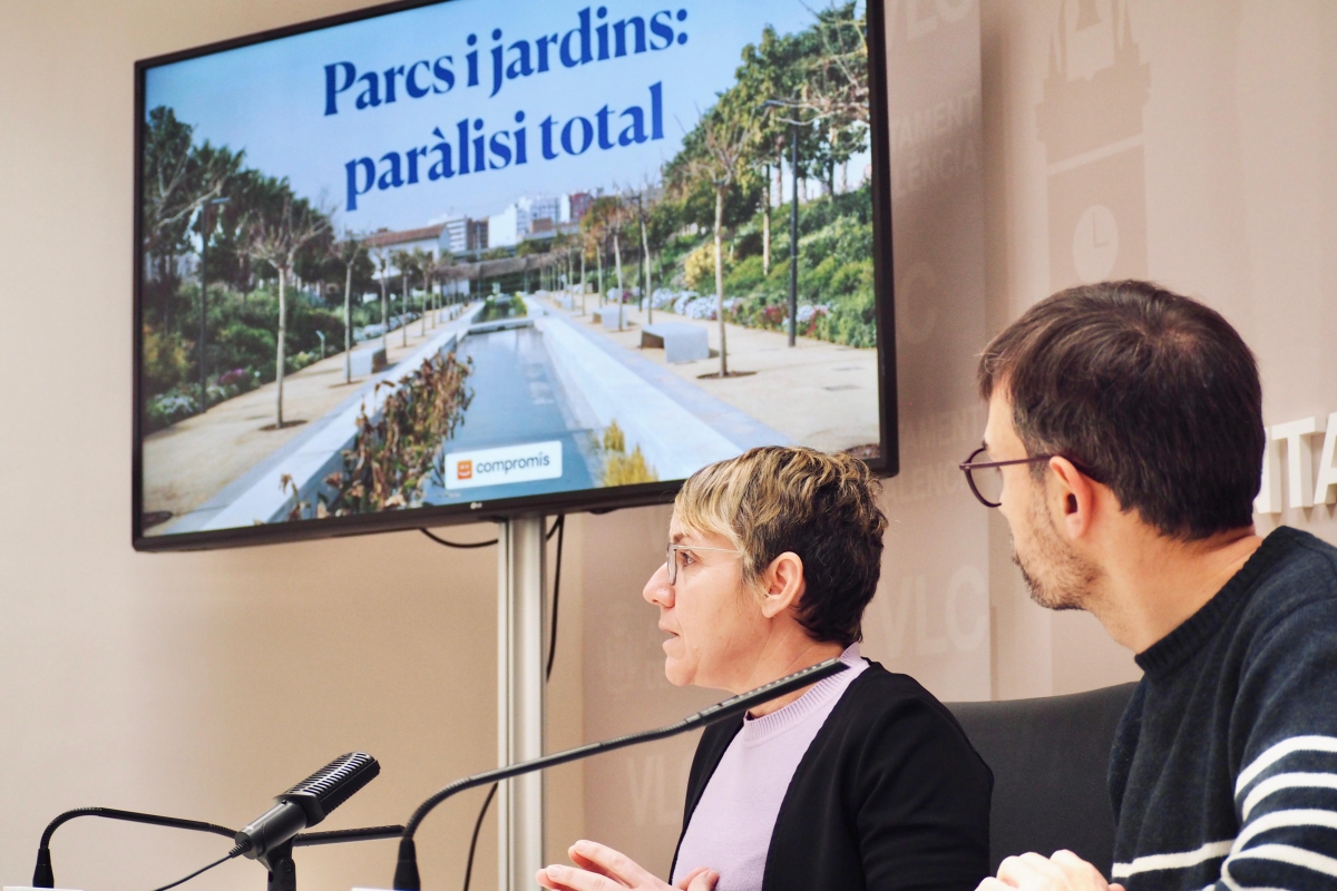 La portavoz de Compromís en el Ayuntamiento de València, Papi Robles, ha ofrecido esta jornada una rueda de prensa junto al edil de este grupo Sergi Campillo para plantear estas cuestiones. Robles ha expuesto que el presupuesto inicial de inversiones en parques y jardines "ya bajó un 21 por ciento de 2024 a 2025, pasando de 8,72 a 6,87 millones de euros" y ha afirmado que "en 2024 no se llegó ni siquiera al 3 por ciento de ejecución".