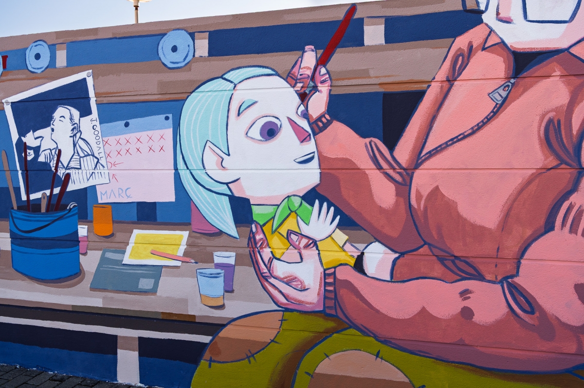 Así, se puede ver, a una de las artistas falleras pintando un ninot que recuerda al de Jane Goodall que formó parte del monumento con el que el año pasado la comisión Carrera de San Luis-Rafael Albiñana ganó el primer premio -con una falla realizada por el artista Fran Tarazona que visibilizó a grandes referentes científicas como Goodall, Valentina Tereshkova o Marie Curie. Precisamente, al otro extremo del mural la segunda de las artistas está modelando la figura que remite al ninot de la investigadora polaca