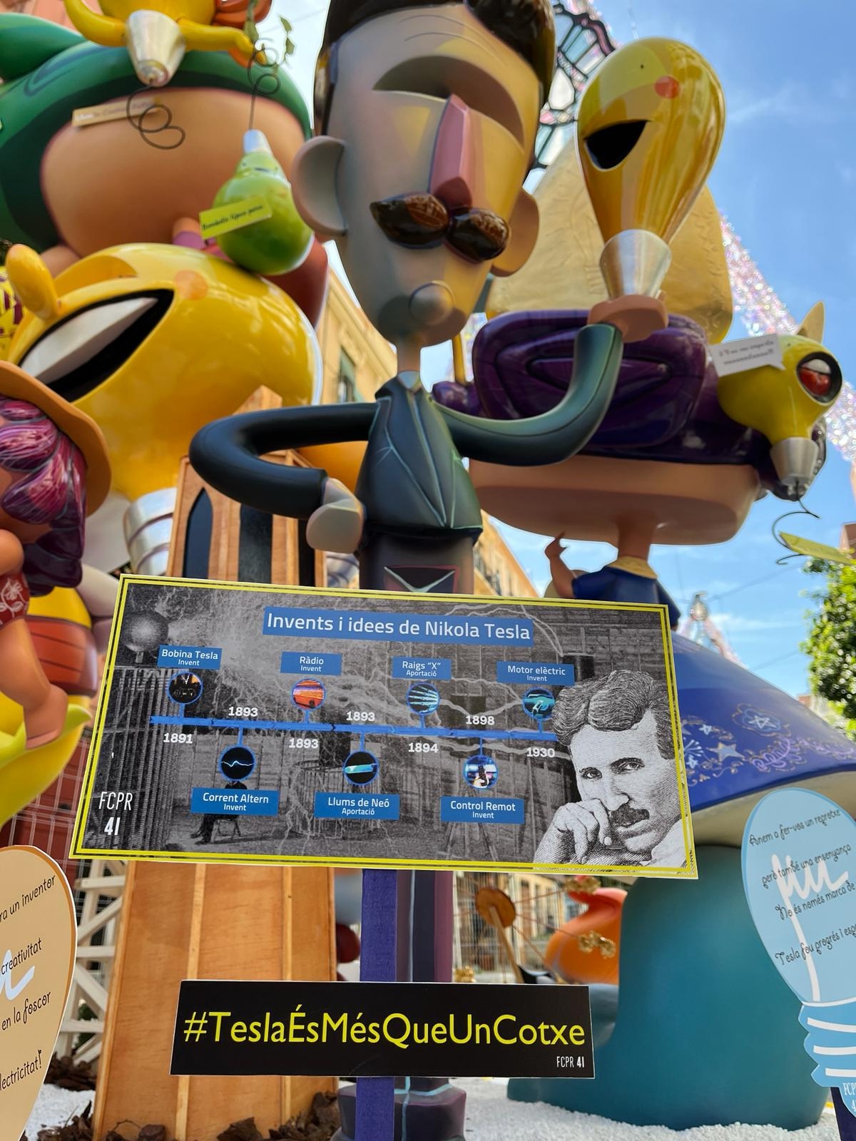 Entre ambas, Andreu Meseguer Torres y Sofía Delgado Alcíbar recrean la entrañable y reivindicativa escena del 11F-Día Internacional de la Mujer y la Niña en la Ciencia- con la que la falla Creu i Mislata, de la mano de Álvaro Guija, se hizo con el primer premio en el año 2024, protagonizada por una niña científica en clase. Y a su lado, un fragmento del ninot de Nikola Tesla con el que la comisión Cuba-Puerto Rico, con el artista Álex López, consiguió el segundo premio ese mismo año.