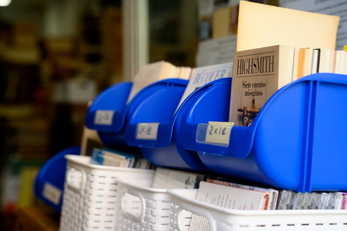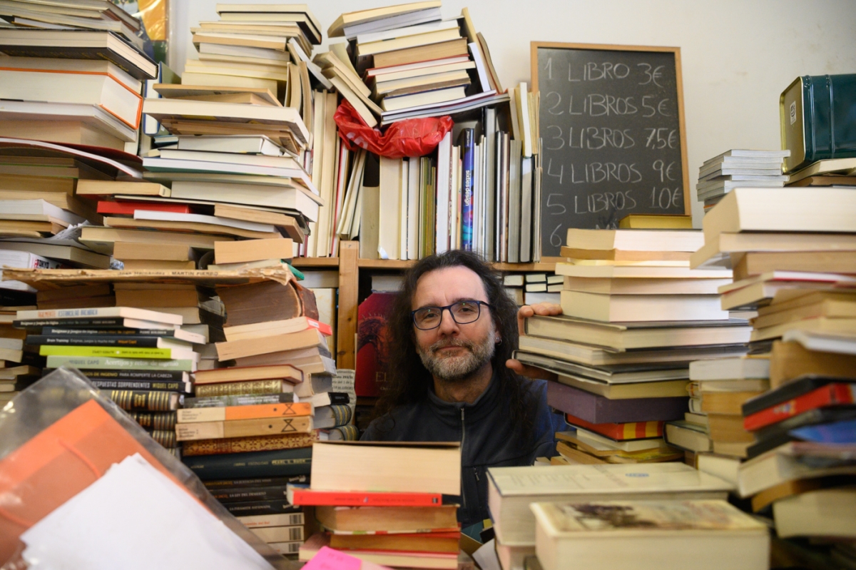 Últimamente ha detectado que también le piden muchas distopías: ‘1984’, de George Orwell, ‘Fahrenheit 451’, de Ray Bradbury, o ‘Un mundo feliz’, de Aldous Huxley. “Debe ser que estamos viviendo en una distopía”. Lo que él no vive es en la utopía de mantener sus decenas de miles de libros en orden. “Yo lo intento ordenar, pero la gente busca y, lógicamente, lo desordena”. A casi todos los clientes les llama la atención que los libros apenas dejen espacio para circular por el comercio. El problema es cuando entran cinco o seis compradores a la vez. Entonces reina el caos y todos tienen que hacer contorsionismo entre las torres de libros para poder cruzarse unos con otros.