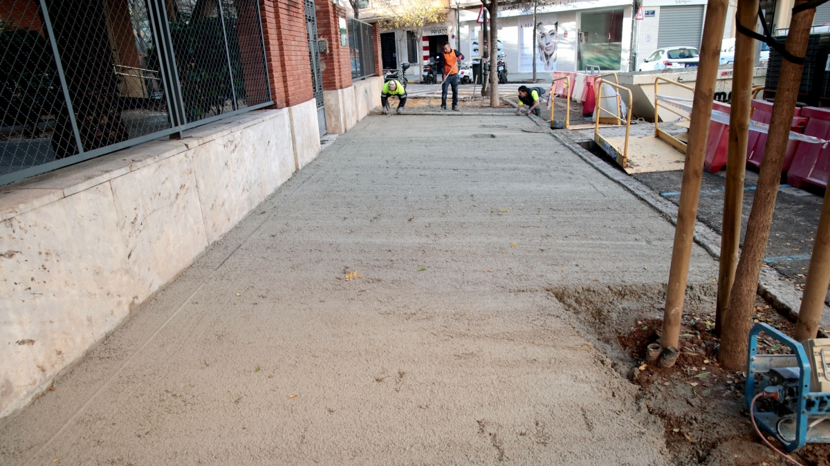 Los trabajos han consistido en la renovación completa del pavimento mediante encintados de bordillo de hormigón tipo Valencia, solera nueva de hormigón, mortero de asiento y pavimento de baldosa hidráulica lisa negra biselada de 20x20 centímetros.