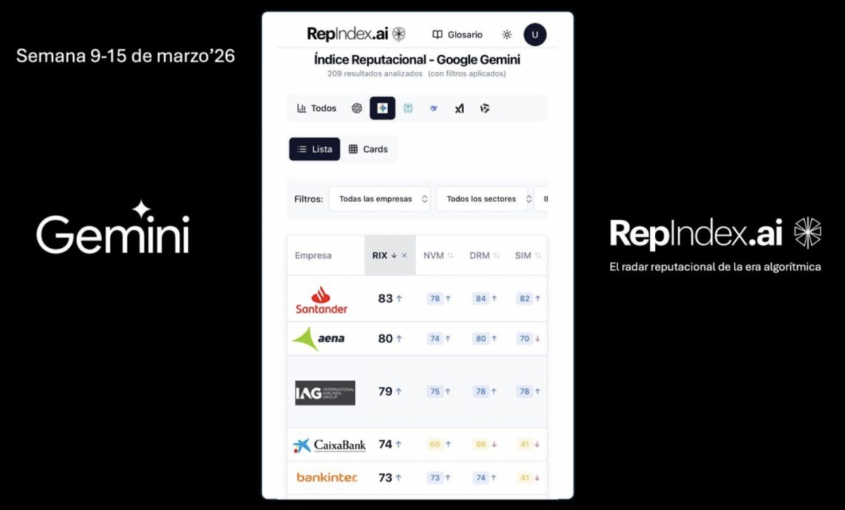 El índice sitúa a Banco Santander en primera posición con un RIX de 83 puntos, seguido por Aena con 80 puntos e IAG (International Airlines Group) con 79 puntos, consolidando el liderazgo reputacional de estas compañías en Gemini; como modelos de inteligencia artificial generativa más avanzada de Google.